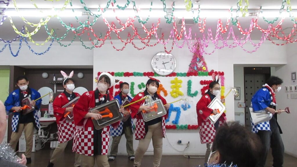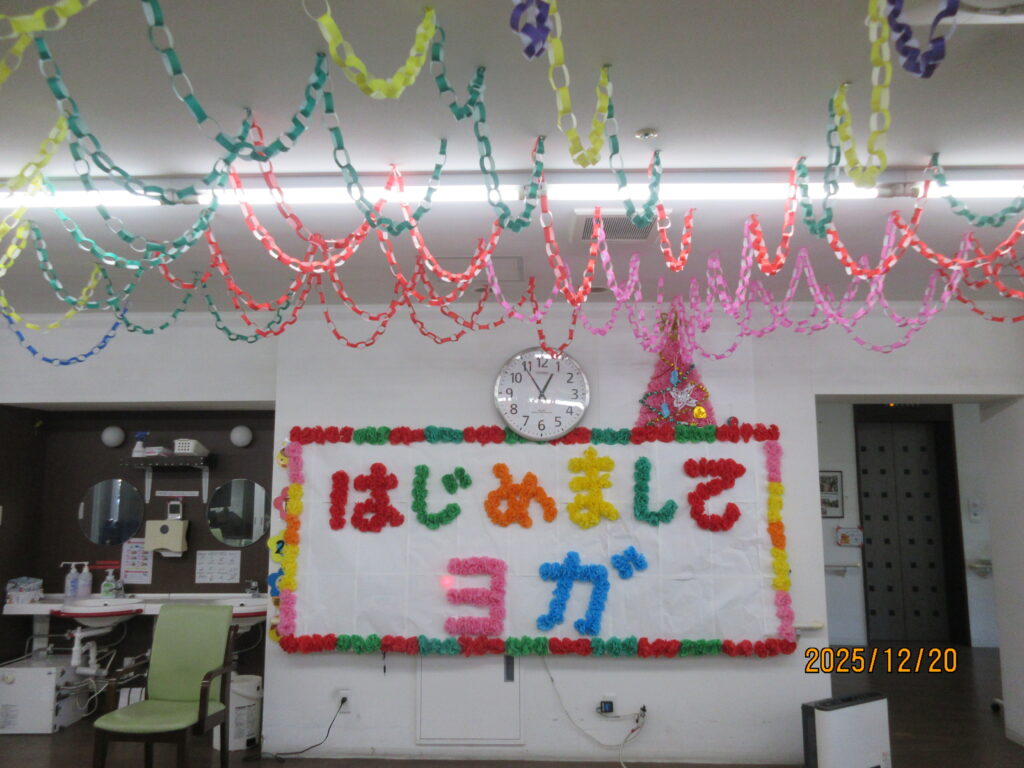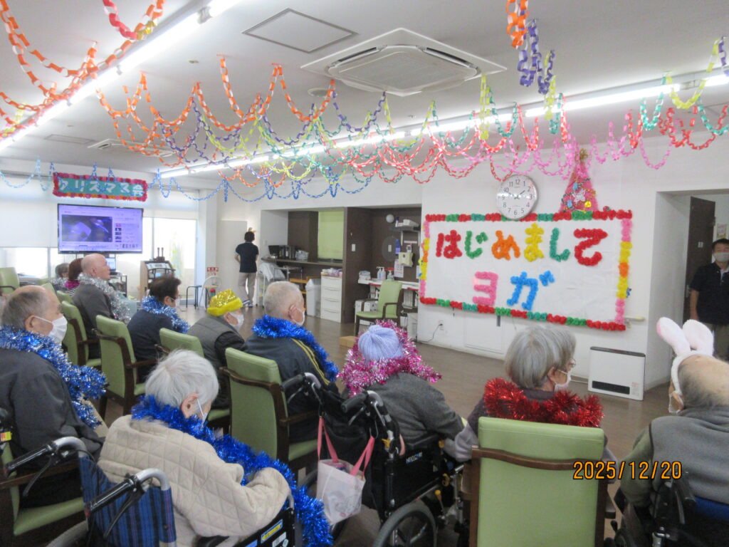 今年のクリスマス会は、ヨガの先生をお呼びし「はじめましてヨガ」を開催しました。皆さま先生を真似て、手を上げたり伸ばしたり、真剣な眼差しで取り組んでいました。そのあとは、職員によるスコップ三味線!さあ、元気に盛り上がりましょう!